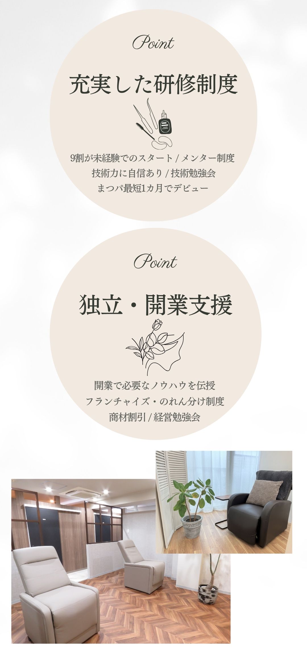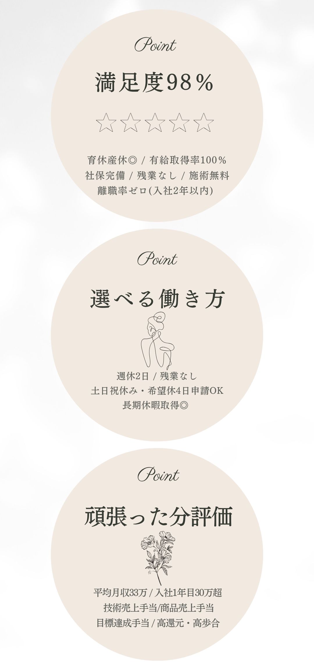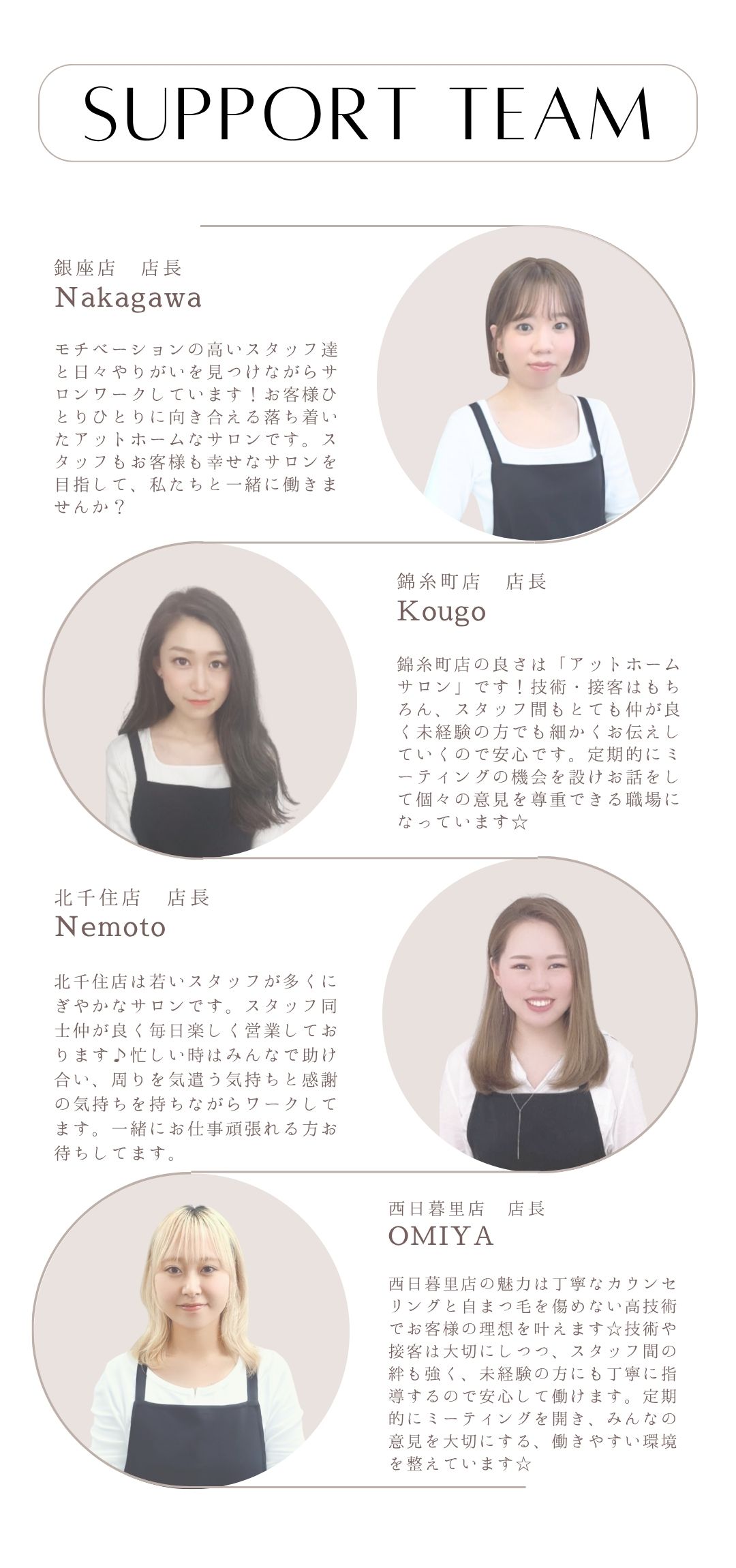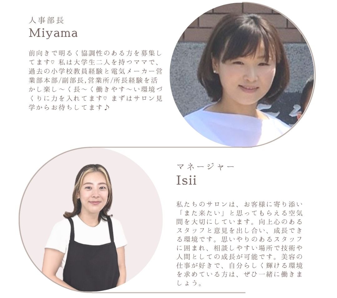 女性だけの職場だからこそ、気配りと思いやり、頑張りと笑いがあふれるような空間づくりを目指しています!まずはどんな雰囲気か見てみたいという方は、サロン見学も可能です。お気軽にお問い合わせください♪