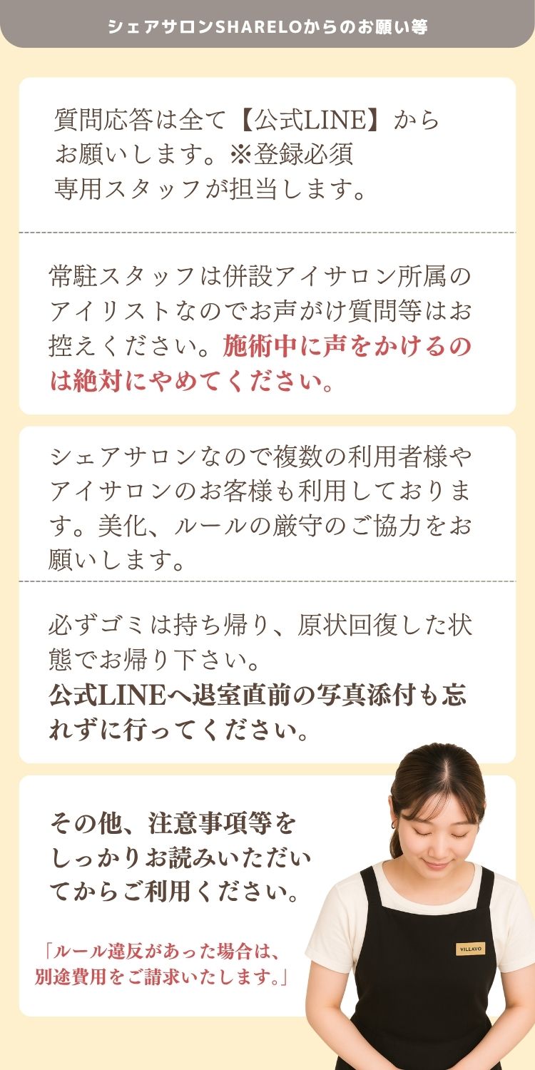 | ・アイリストは美容師免許の確認等が必要となりますのでルーム利用ご希望の方はお問い合わせください。 |