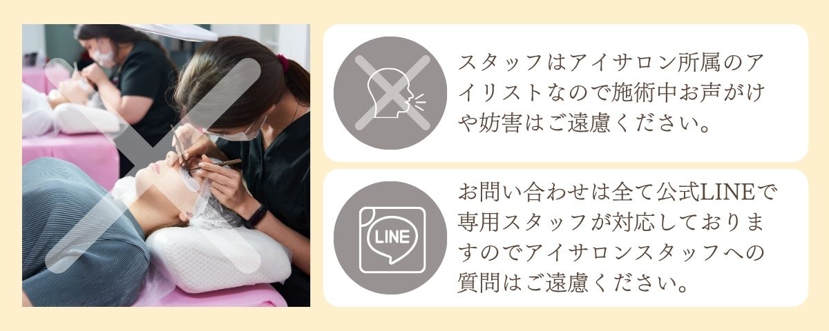 ・スタッフはアイサロン専属のアイリストなのでお問い合わせや質問は全て【公式LINE】へお問い合わせください。 |