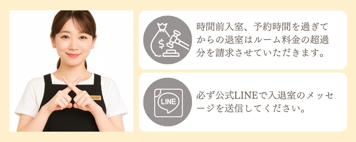 | ・公式LINEの【登録】【入退室報告】【退室時のルーム、利用箇所の写真の添付】は必須項目です。拒否される場合は今後のご利用をお断りする場合があります。 |