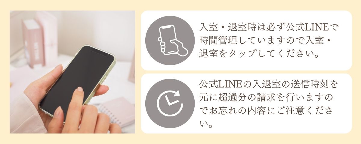 ・入室・退室時は必ず【公式LINE】で時間管理をしておりますので入退室ボタンを送信してください。※時間前、時間後になった場合請求対象となる場合がございます。