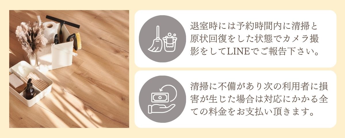 | ・清掃後は必ず利用した箇所の写真を撮影してLINEでご報告ください。※ご連絡がない場合はこちらから確認メッセージをお送りさせて頂ております。 |