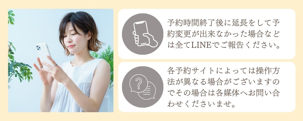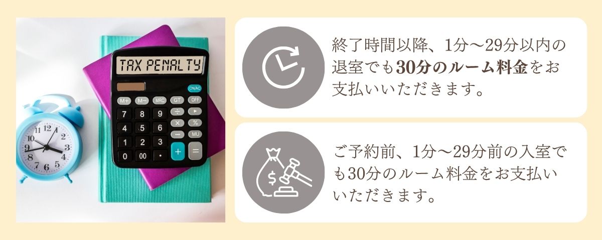 ・延長については予約に空きがある場合はご自身で予約サイトから【延長リクエスト】等で予約時間の変更を行ってください。無断に延長した場合や時刻前にROOMへ入室した場合は1分~29分の超過となっても30分のルーム料金を請求させていただきます。