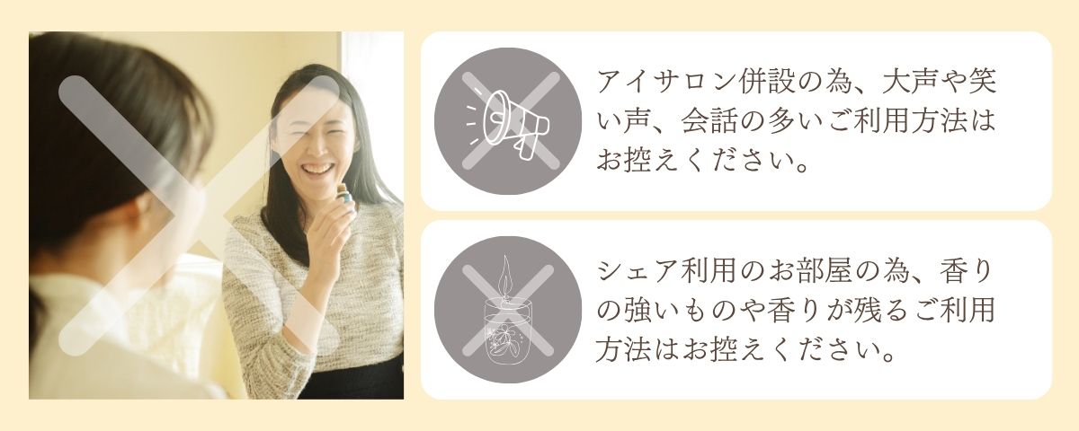 ・施術中の過剰な会話はなるべく控えめにお願いします。(マツエクサロン併設の為)また、まつ毛サロンは静かな施術になることが多いので会話の内容などもご配慮ください。