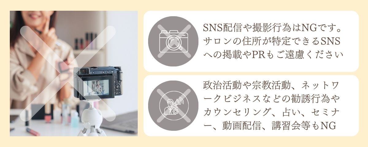 | ・サロン住所の公開、SNSやインターネットへの公開 |