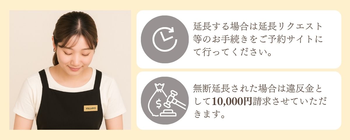 ・延長する場合は延長リクエスト等のお手続きをご予約サイトにて行ってください。ルーム利用終了後に延長を申し出る場合は、事務手続きを致しますので必ずスタッフにお声がけください。その場で価格変更リクエストの承認を行っていただきます。(終了時間以降、1分~29分以内の退室でも30分のルーム料金をお支払いいただきます。)スタッフに声がけもなく、無断延長された場合はその場で違反金として10,000円(税抜)お支払いいただきます。